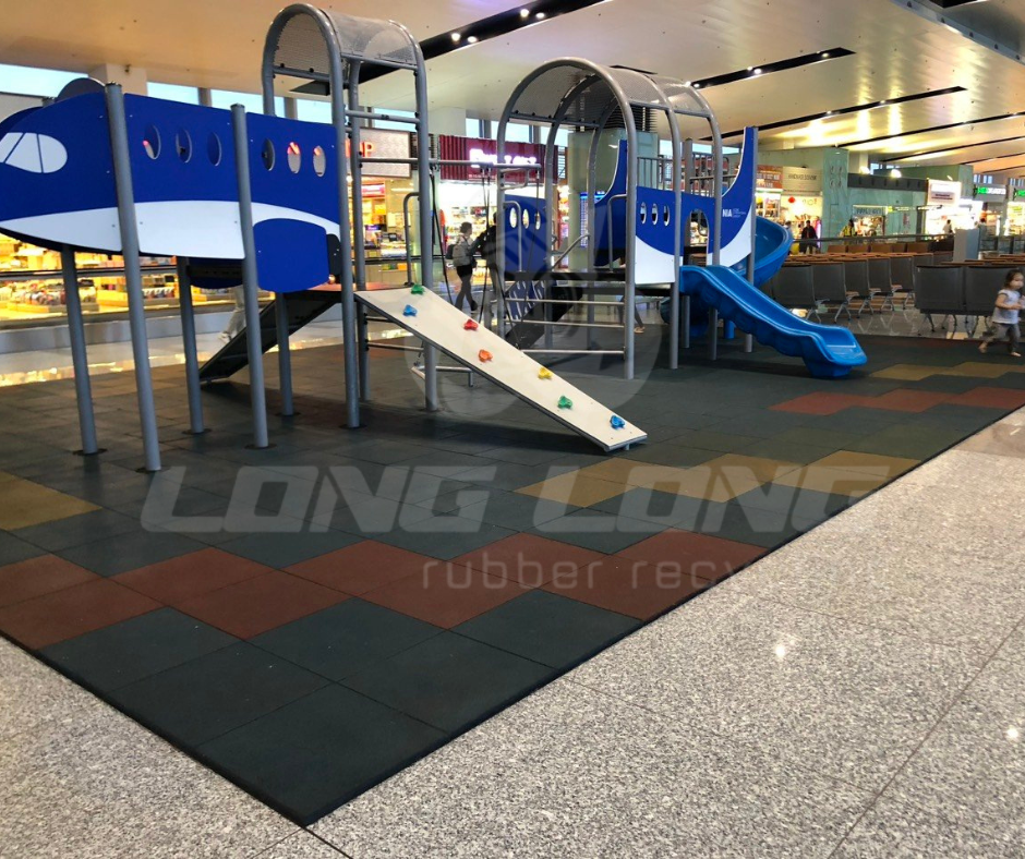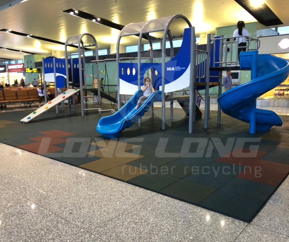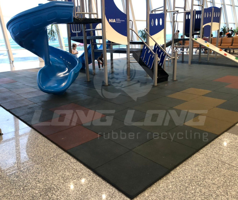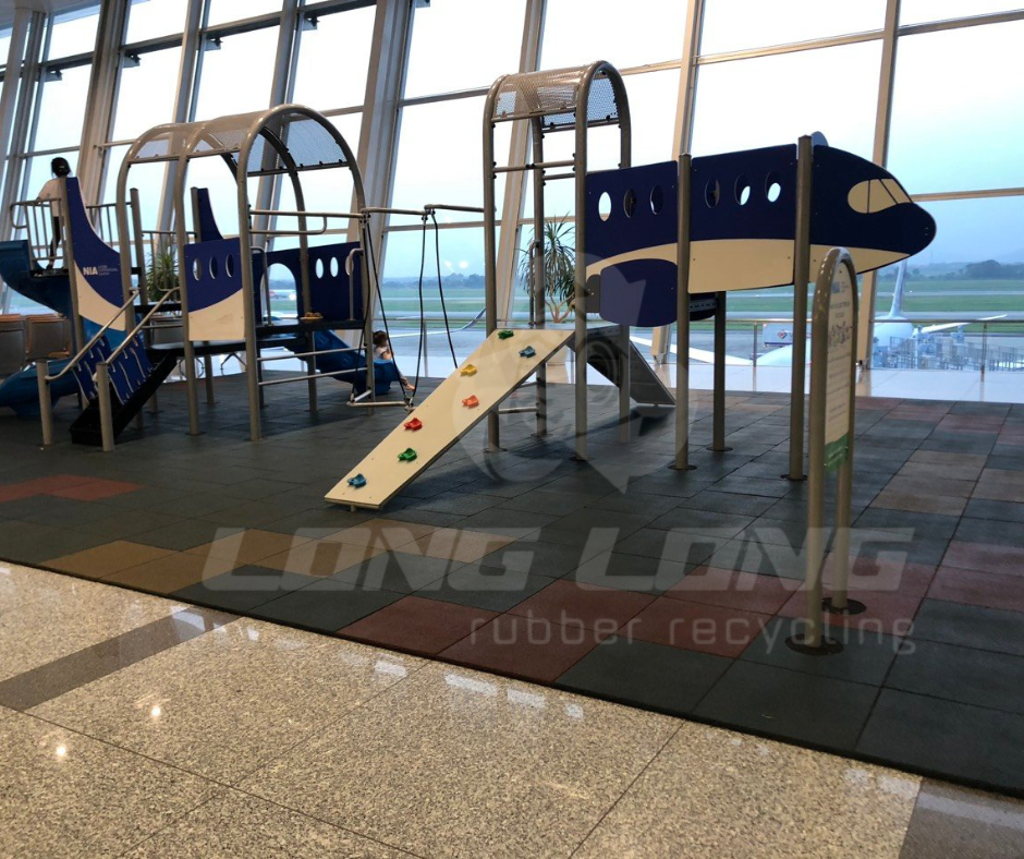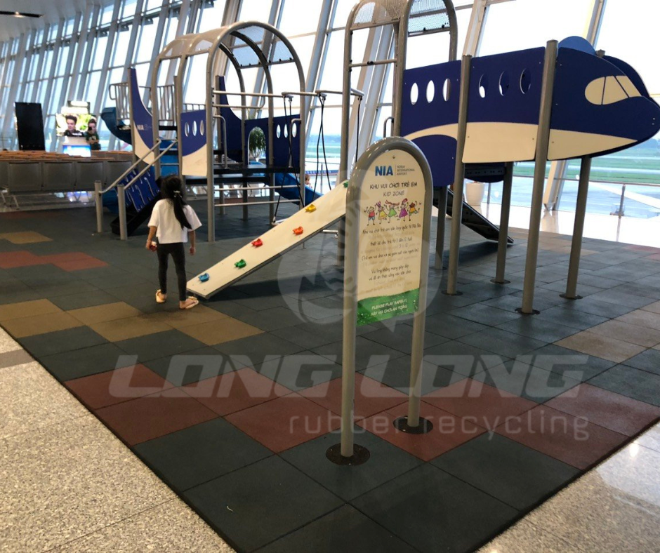 Khu vui chơi dành cho trẻ em ở Sân bay Nội Bài, Hà Nội đã sử dụng gạch cao su mặt nhám với nhiều màu sắc khác nhau giúp đảm bảo sự an toàn cho trẻ em khi vui chơi, chạy nhảy và làm tăng thêm tính thẩm mỹ cho khu vực này tại sân bay.