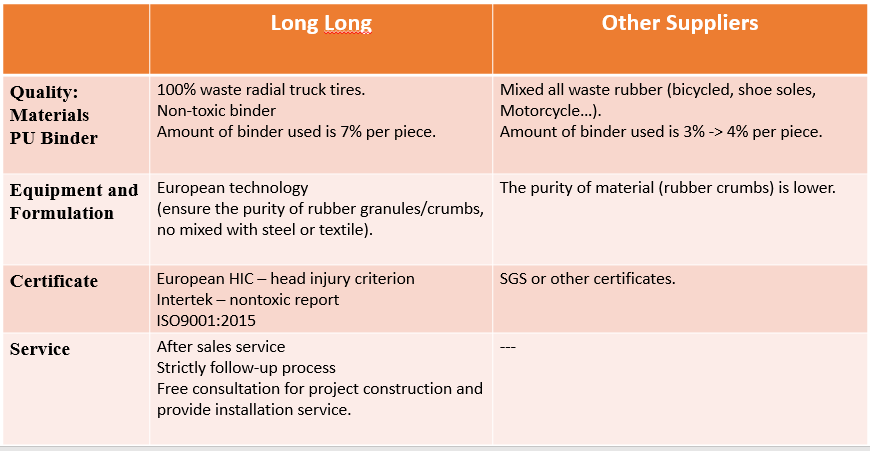 We have two ultra-modern factories in Hanoi invested with European advanced technology, we solved waste/old truck tires and grind to recycled rubber crumbs/granules, then produce high quality playground rubber tiles.