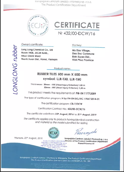 Our rubber tiles products get the highest quality with HIC CERTIFICATE – EUROPEAN STANDARD. The priority of the European Center for Quality and Promotion is also to ensure the safety of children and other users who use recreational and play equipment. HIC is head injury criterion, fall height level for outdoor rubber flooring for playgrounds.
