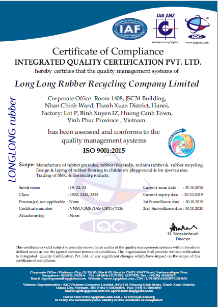Our European-standard factory is located in Vinh Phuc which is a leading one in Vietnam to recycle old tires to finish products like rubber powder, rubber rolls, rubber mats…..We’re the playground rubber tile manufacturer can produce on large scale of rubber sport flooring tiles with highest quality and committed to the environmental change.