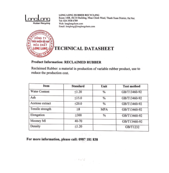 Dưới đây là thông số kỹ thuật của sản phẩm cao su tái sinh loại tiêu chuẩn: