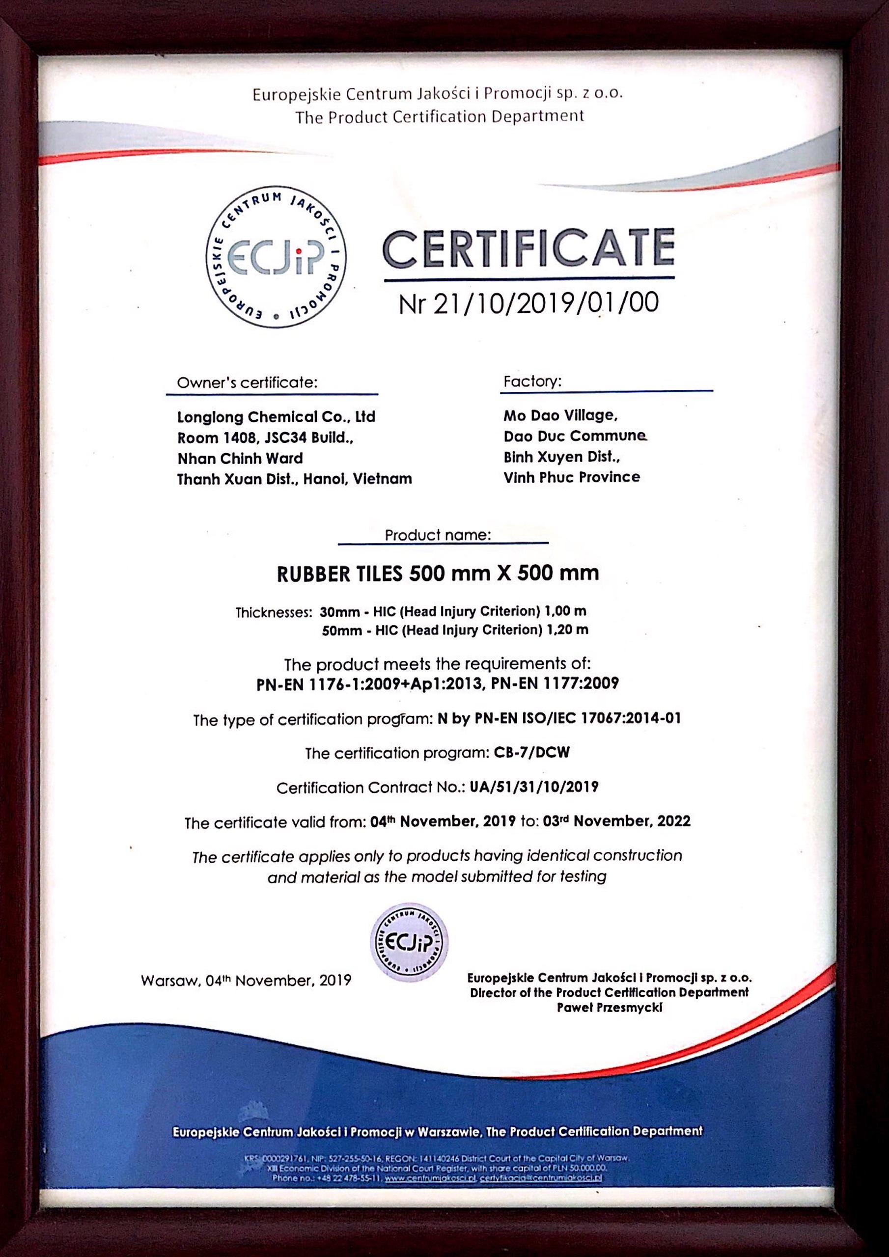 Chúng tôi cam kết đem lại sản phẩm với sự xuất sắc về kỹ thuật và kiểm soát chất lượng toàn diện, đảm bảo rằng phụ huynh có thể yên tâm và thư giãn trong khi con mình vui đùa. Gạch cao su Long Long cho sân chơi ngoài trời là sản phẩm lý tưởng để sử dụng trong nhà và ngoài trời. Sản phẩm của chúng tôi tuân thủ và đạt tiêu chuẩn quốc tế, đươc ghi nhận bởi các chứng chỉ:
